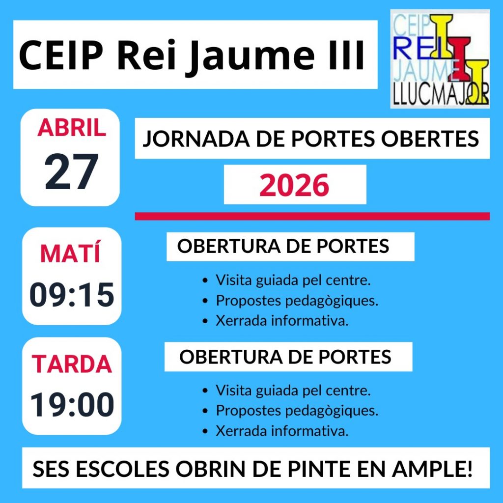 Per qualsevol consulta, no dubteu en contactar amb nosaltres per correu electrònic (ceipreijaumeiii@educaib.eu) o per telèfon (971660555).